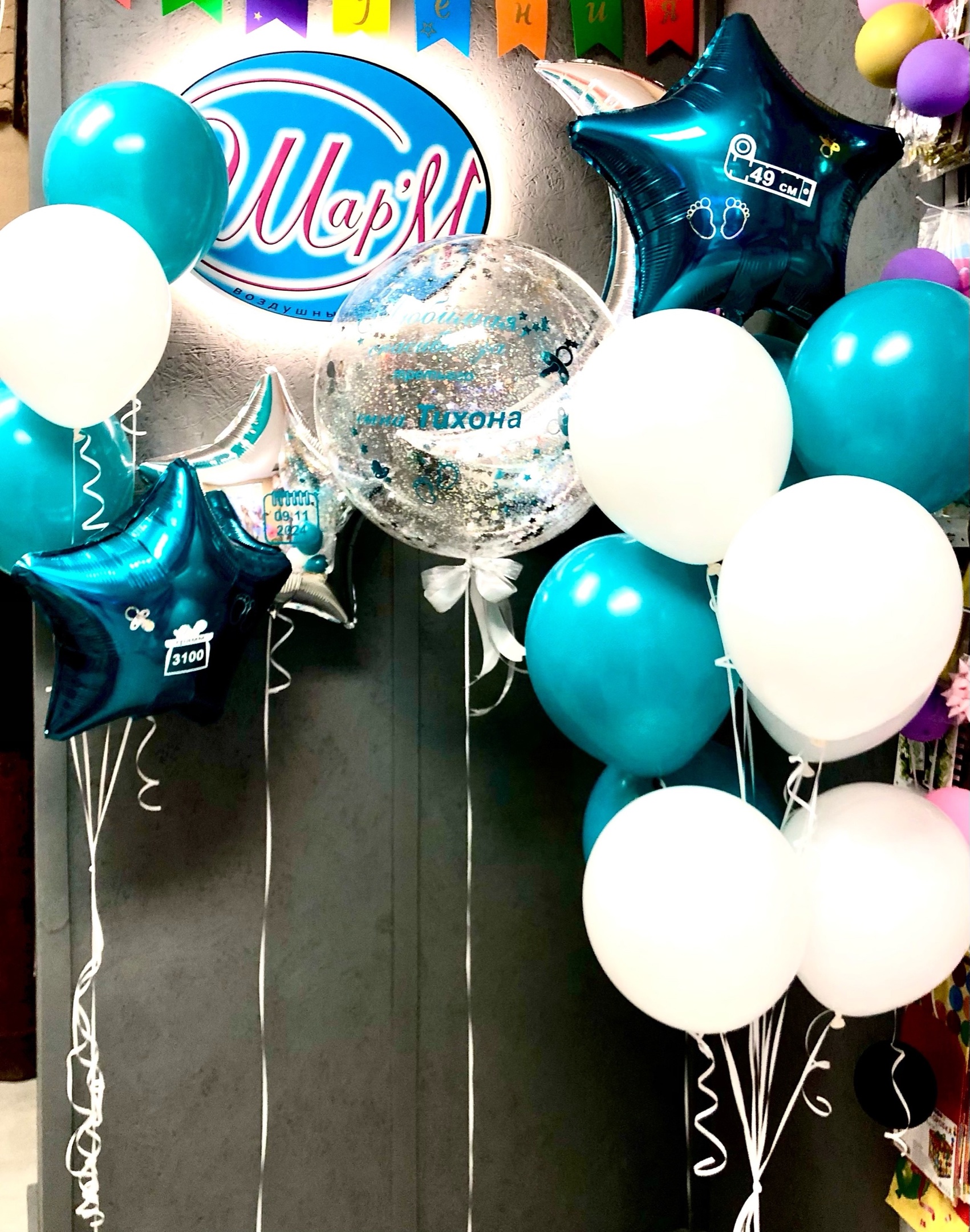 Фонтан из шаров наполненных гелием: звезда 46 см с индивидуальной надписью, 3 шара пастель; Звезда 46 см с надписью на грузе; Прозрачная сфера 45-50 см с конфетти на грузе + надпись; Фонтан из шаров: звезда 46 см с надписью, 9 шаров пастель.Полумесяц на г
